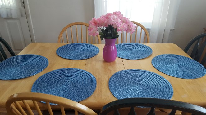 After we were home and settled I gave my kitchen table a little make over. I love the Dollar Tree. While I do believe in you get what you pay for, I also know that you can find some great bargains there. For $9 plus tax I gave my kitchen some nice color. Plus I have little kids, who knows how long they will leave it alone anyway .