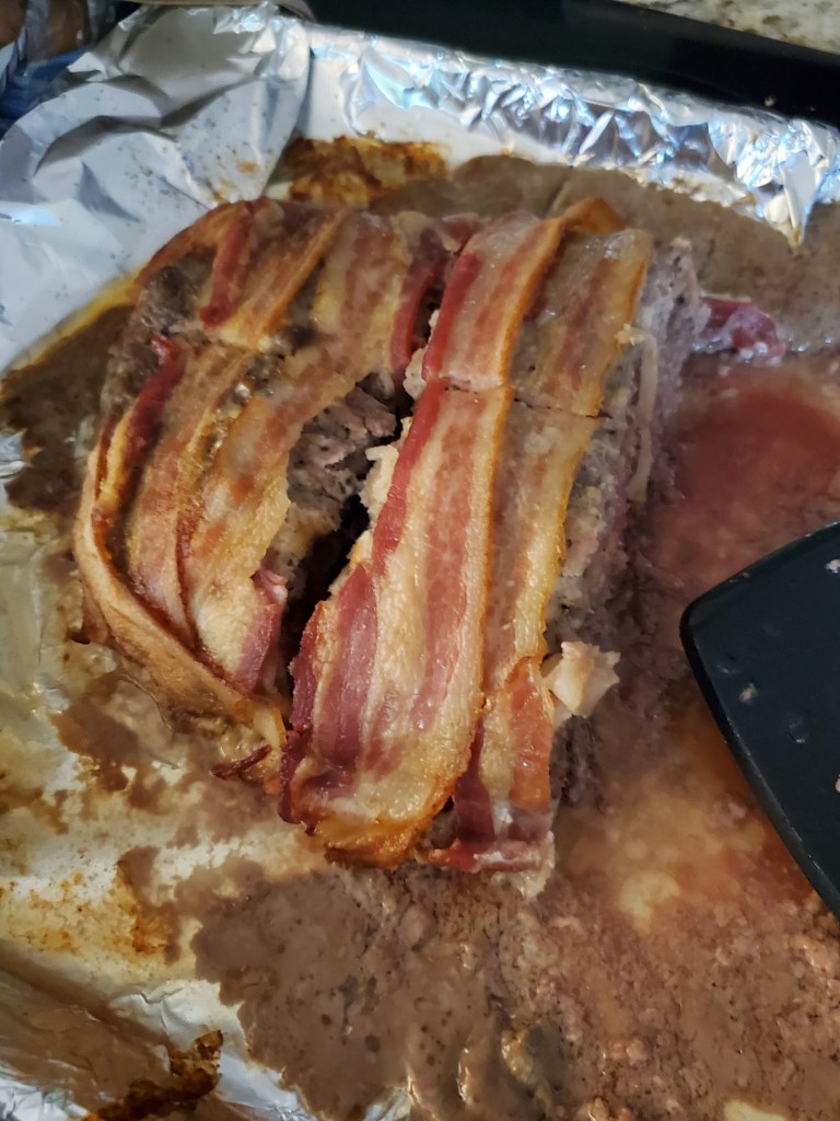 Since my kids love bacon I took one package of bacon and covered the top of my meatloaf with it.