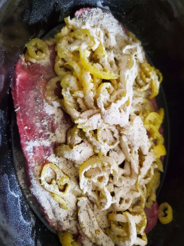Sprinkle the ranch packet on top of the beef and banana peppers.