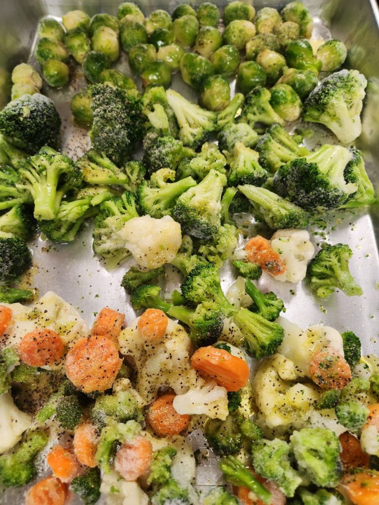 To a sheet pan add some frozen veggies. Fresh would probably work too but I have not personally tied. Frozen veggies are much more friendly in terms of using before they go bad š season as you’d like. I did salt pepper and garlic.