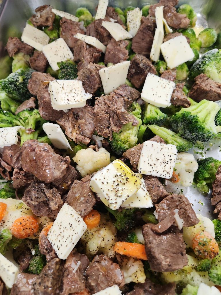 On top of the veggies add your stew beef and butter. How much butter? Let your heart decide! I added one stick cut up over the sheet.
